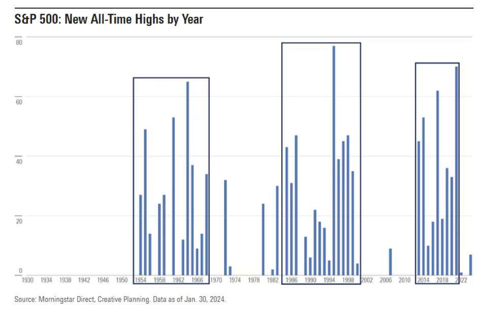 History suggests that attempting to “time the market” by waiting for a dip is a recipe for missed opportunities. As shown in the chart below, the S&P 500 has consistently reached new highs throughout history, and even many times in the same year.