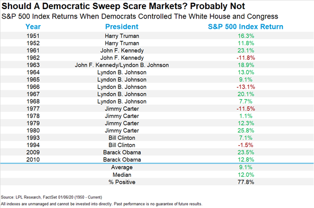 With the Georgia runoff and the Democrats flipping the Senate seats, they now control the House, the White House, and, likely, the Senate. Historically, markets prefer a split government. However, according to LPL, these are the most recent returns during a democratic “sweep.”